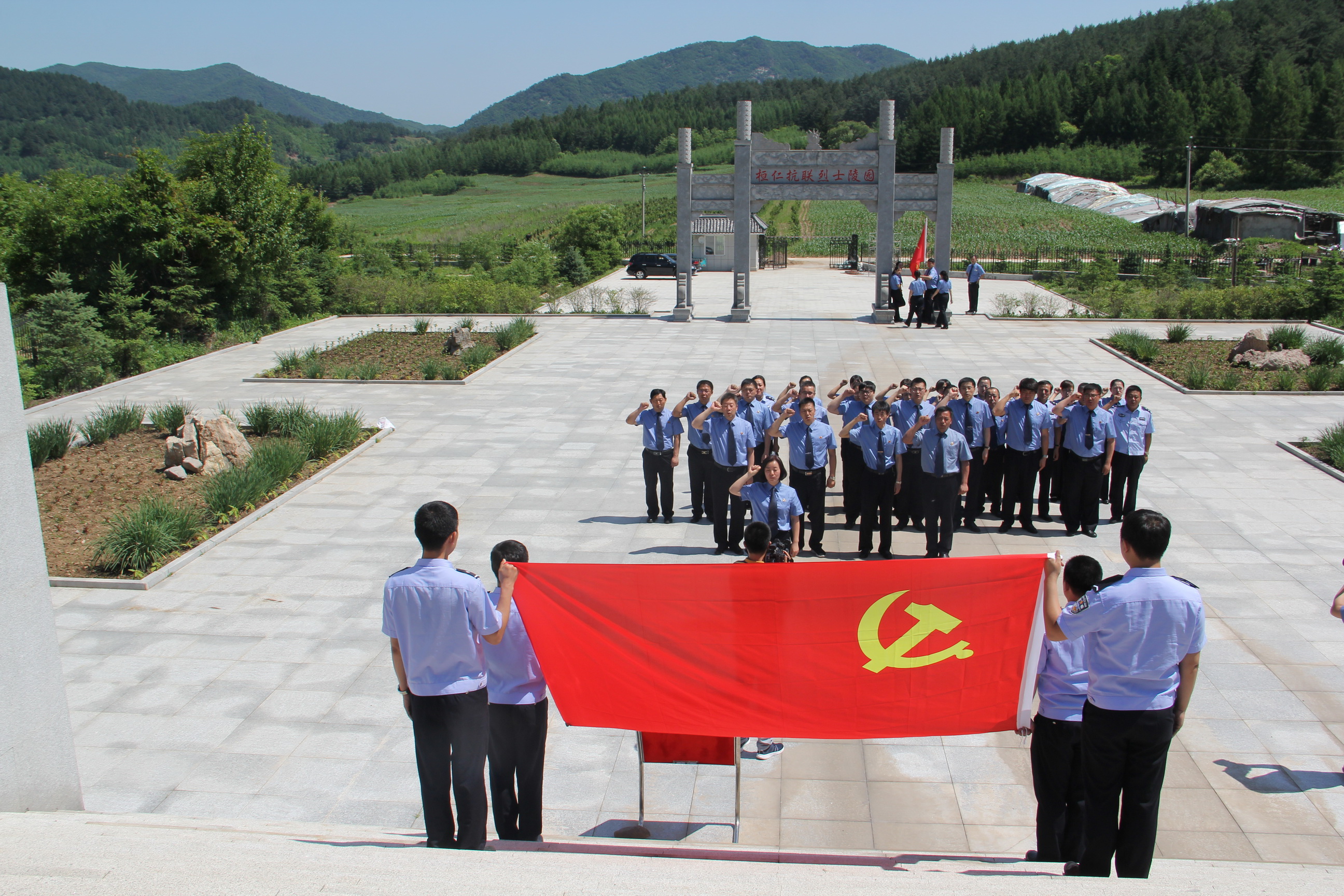 活动当天,全院党员干警沿着东北抗日联军曾经的行军路线一路前行,来到位于木盂子镇的抗联烈士陵园,向抗联烈士们鞠躬致敬,党组书记、检察长郝慧利带领全体党员在烈士纪念碑前重温入党誓词。