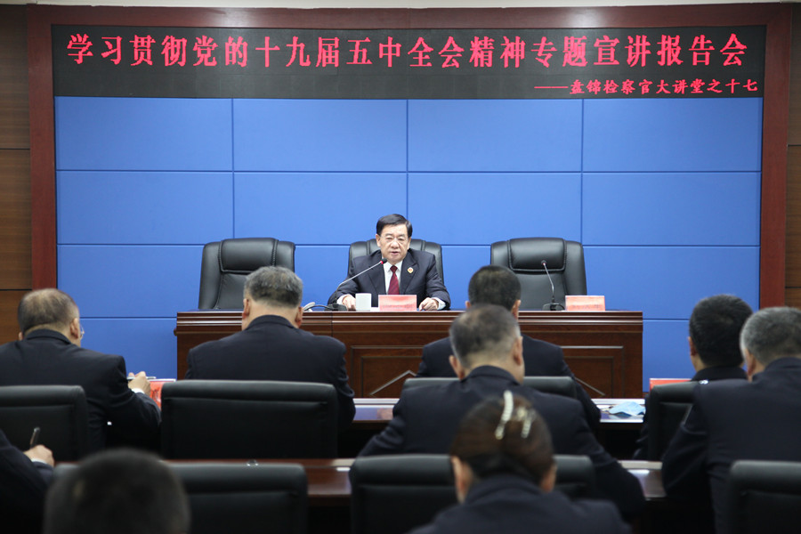 12月4日,盘锦市检察院举办了学习贯彻党的十九届五中全会精神专题宣讲报告会。党组书记、检察长邴志凯以“学习贯彻党的十九届五中全会精神 推动盘锦经济社会高质量发展”为题,为全体检察人员进行专题授课。各党支部书记、组织委员、宣传委员,各内设机构正副职,全体员额检察官参加了会议。