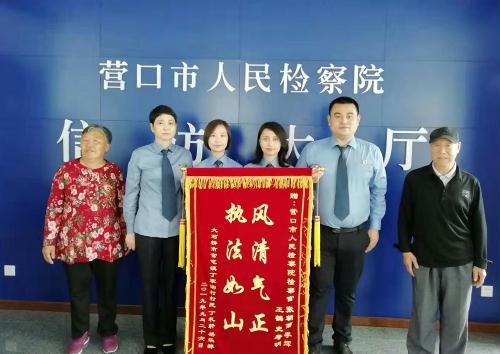 十一前夕,81岁的丁某与妻子岳某怀着激动的心情将一面鲜红的锦旗送到了营口市检察院,以他们表达对王鹤、张朝菊、史焘铭等检察干警的感谢之情。