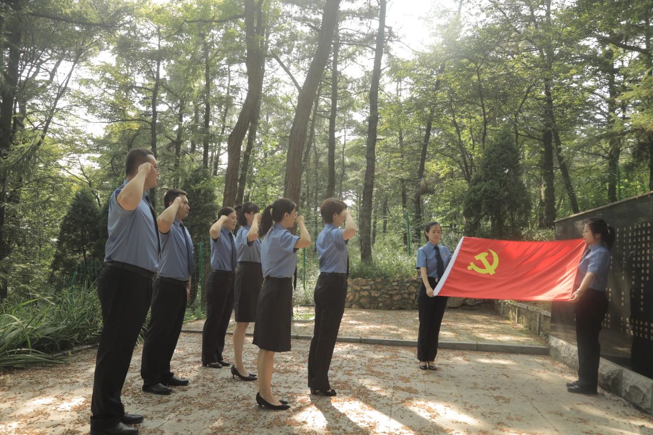 在烈士纪念碑前,检察干警在院党总支部书记李丹的带领下,面对党旗,握紧右手庄严宣誓,重温入党誓词。