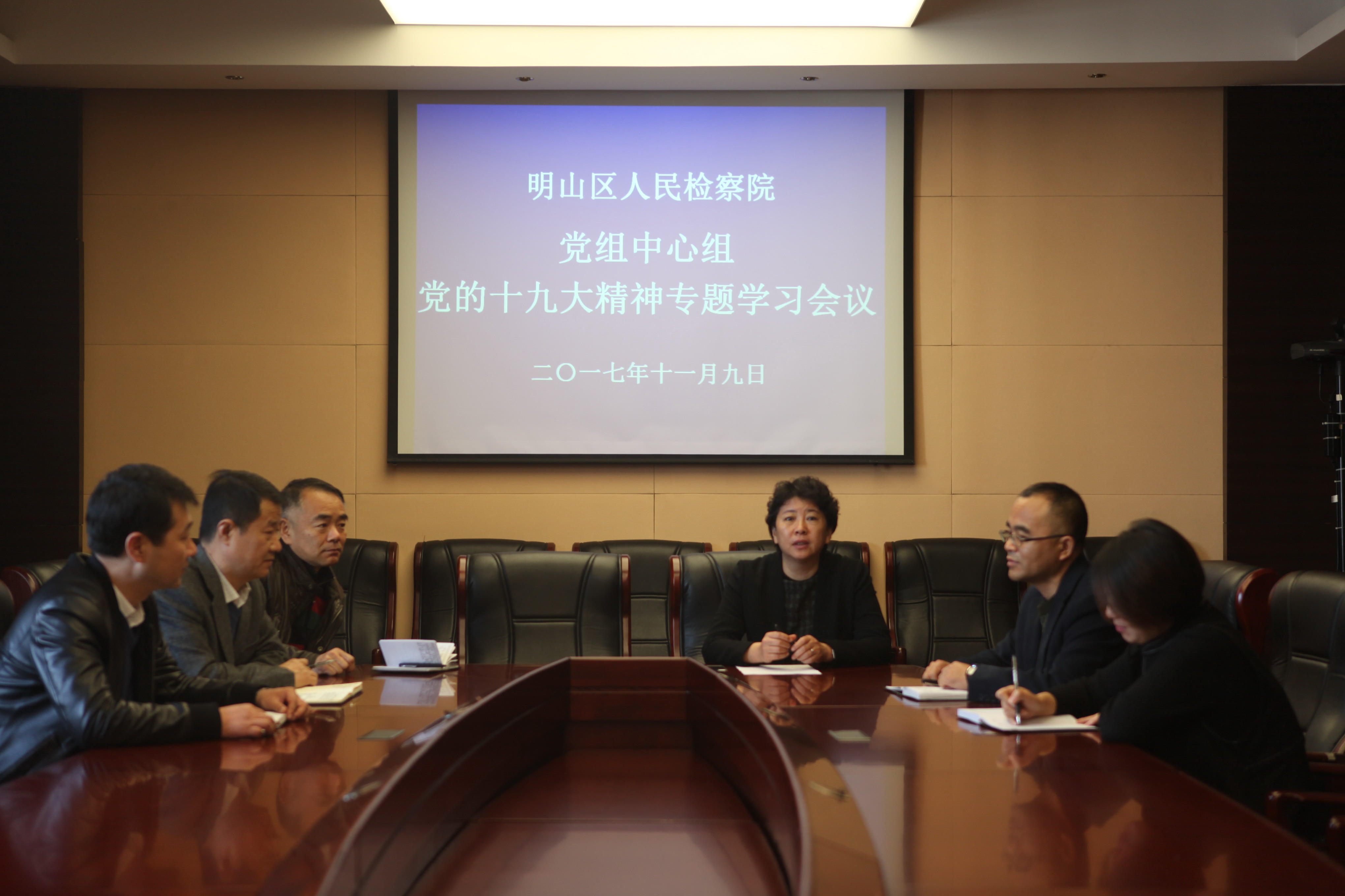 为深入学习贯彻党的十九大精神,更好地以十九大精神为引领,为本院新时期检察工作举旗定向,2017年11月9日,本溪市明山区人民检察院党组中心组召开会议专题传达学习10月26日最高人民检察院全体党员干部大会上曹建明检察长讲话精神和11月6日全省检察机关学习贯彻党的十九大精神电视电话会议精神,以此在全院迅速掀起学习宣传贯彻党的十九大精神热潮。