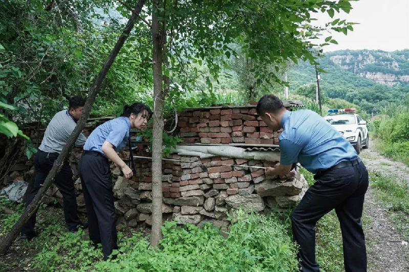 ▲检察干警丈量违法压占埋地军用输油管道的地上建筑