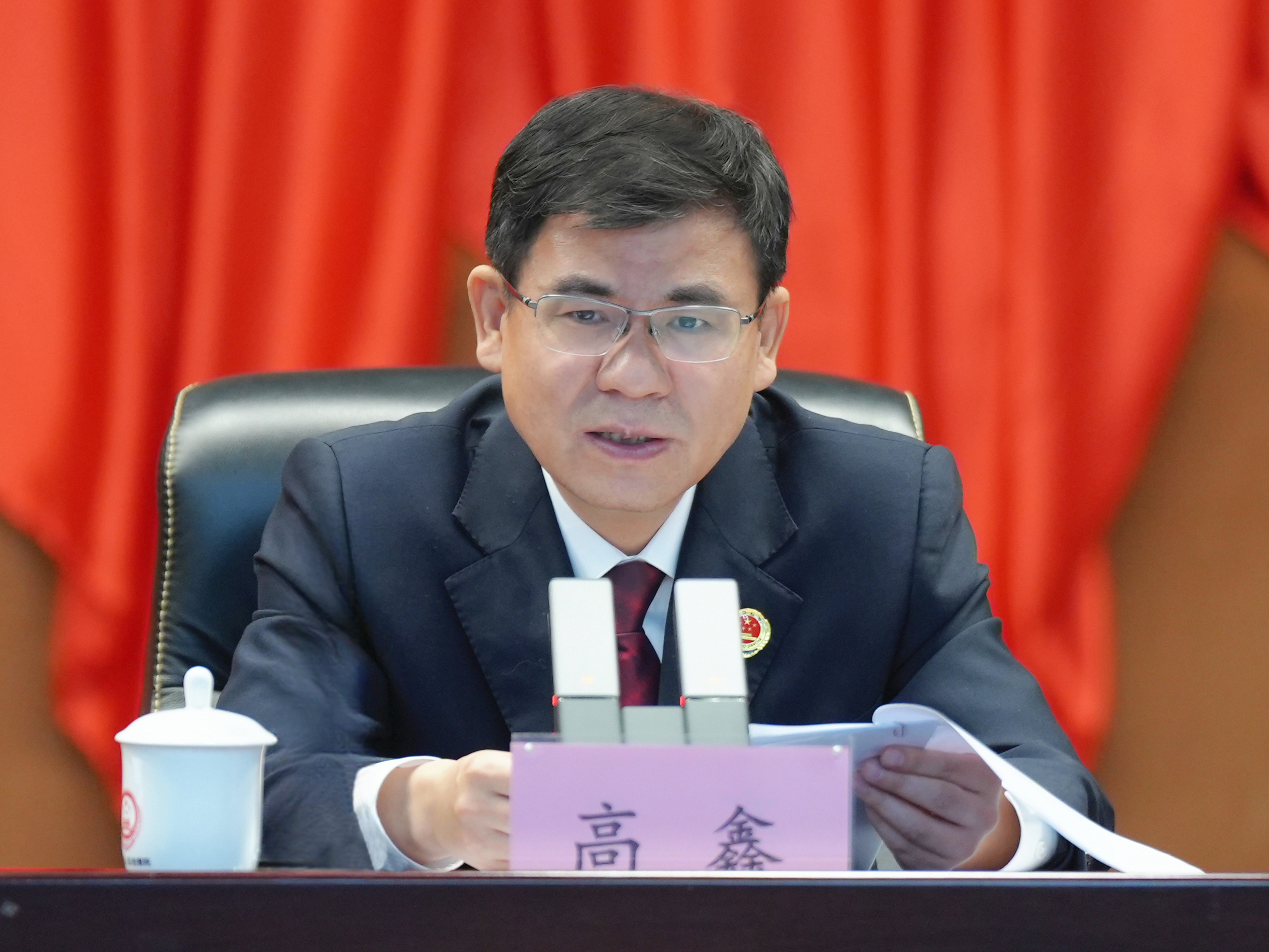 ▲图为王中王论坛 党组书记、检察长高鑫主持会议并作表态发言